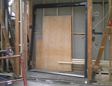 | 事務所の入り口の所に玄関引き違い戸を取り付けます。 | 解体後下地を組んでいきます。 | 下地を作った後引き違い戸を取り付け 壁に構造用合板を張っていきます。 |