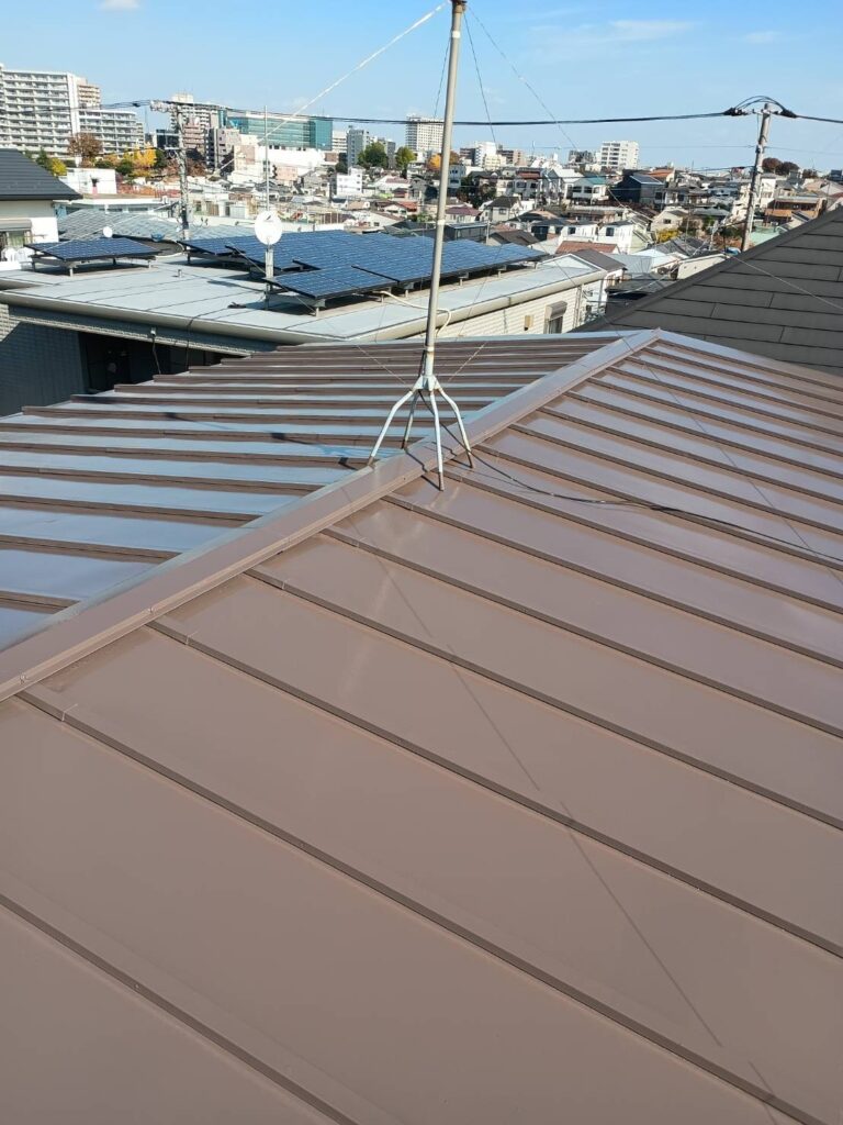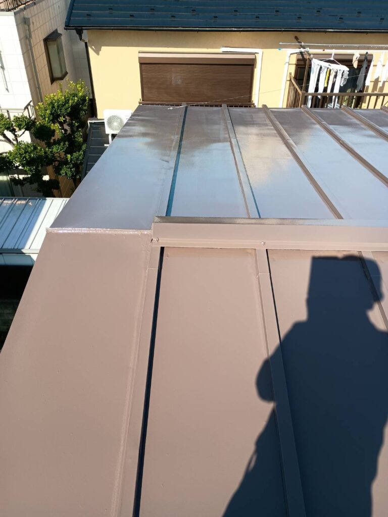 実際に屋根に上がって確認してみると、特に板金も取れそうにはなっておらず、軒先の部分の塗膜の剥がれがありました。